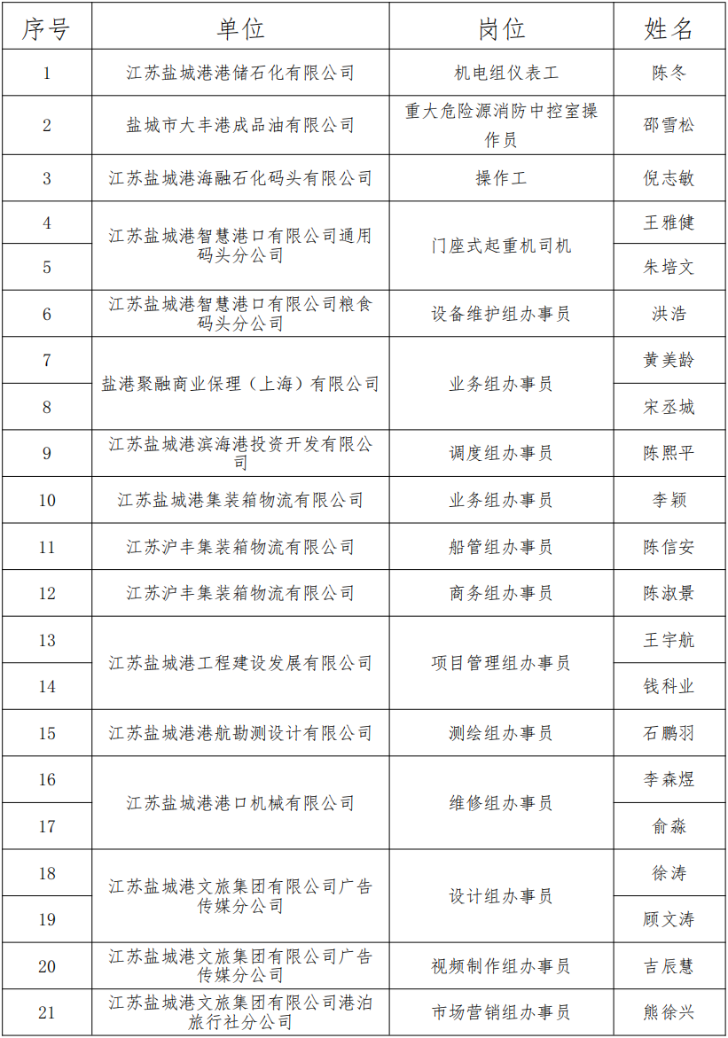 根据2024年7月7日发布的《海角社区 招聘公告》相关程序规定,现对24名拟录用工作人员进行公示(另外江苏盐城港拖轮服务有限公司船管组办事员岗位拟聘人员均自愿放弃)。