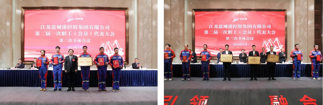 会议现场为荣获2023年市技能竞赛先进集体、“盐城市五一创新能手”先进个人、首届长江港口门式起重机集装箱岸边吊操作工职业技能竞赛团体一等奖、中华全国总工会“云宣讲”达人的单位及个人颁奖。