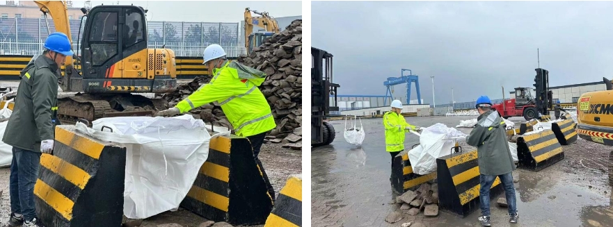 在接到这一“急单”后,响水港区迅速响应,立即着手制定详细作业计划,作业计划明确到各个环节责任人和时间节点。在面对港区现有资源匮乏的困境,生产组副组长顾海伟挺身而出,向客户和领导立下军令状,保证按时完成紧急任务。港区积极协调各类机械和人员调配,在港区机械有限的情况下,从社会各界连夜联系租用挖机,同时组建了一支临时灌装“作战队伍”。