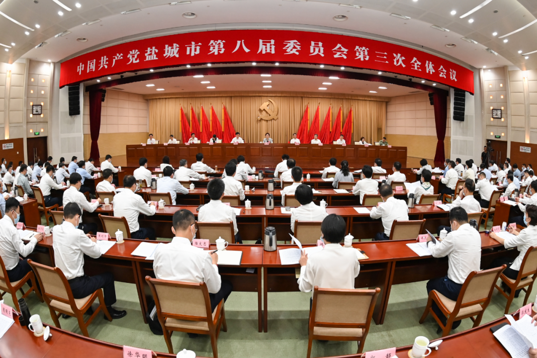 8月9日,中国共产党盐城市第八届委员会第三次全体会议举行。全会坚持以习近平新时代中国特色社会主义思想为指导,深入学习贯彻习近平总书记在省部级主要领导干部“学习习近平总书记重要讲话精神,迎接党的二十大”专题研讨班上的重要讲话精神,全面落实“疫情要防住、经济要稳住、发展要安全”重大要求,认真落实省委工作会议精神,总结上半年工作,部署当前和今后一段时期重点任务,竞逐绿色低碳发展新赛道,勇当沿海地区高质量发展排头兵,为全省“勇挑大梁”多作贡献,以实际行动迎接党的二十大胜利召开。