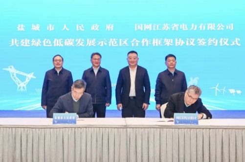 1月4日,盐城市政府与国网江苏省电力有限公司签署共建绿色低碳发展示范区合作框架协议。市委书记周斌,市委副书记、市长张明康会见国网江苏电力董事长谢永胜一行,并共同见证签约。