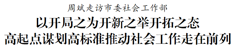 组建党委社会工作部,是以习近平同志为核心的党中央坚持和加强党的全面领导、推进国家治理体系和治理能力现代化的重大举措。市委坚决贯彻落实党中央和省委决策部署,组建成立社会工作部。走访中,周斌察看市委社会工作部办公环境,与工作人员深入交流,了解大家岗位职责以及工作磨合情况,鼓励要切实增强责任感、使命感、荣誉感,围绕机构职能履职尽责,相互配合、促进融合、做好联动,在新征程上展现新气象、体现新担当、作出新贡献。