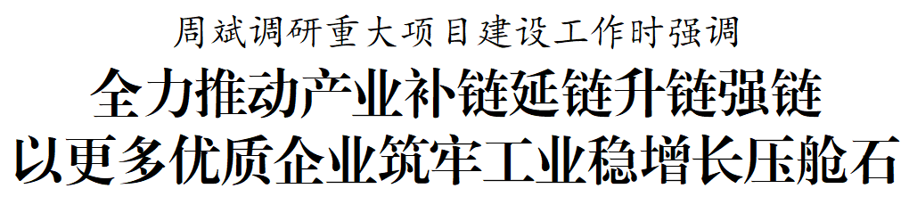 周斌在调研中强调,重大项目是撑起我市经济社会发展的“硬脊梁”。各地各部门要切实增强责任感紧迫感,牢固树立“项目为王”理念,围绕“5+2”战略性新兴产业和23条重点产业链,持续掀起招商引资和项目推进热潮,夯实高质量发展的根基。围绕推进新型工业化与新质生产力良性互动,抢抓大规模设备更新等机遇,推动制造业技术改造升级,实现高端化、智能化、绿色化发展,大力构建现代化产业体系。要做好为企服务,擦亮“盐诚办”金字招牌,抓好企业发展“三件事”,助力企业各展所长、深化合作,全面激发发展的内生动力和活力。