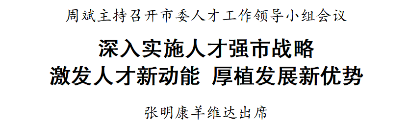 会议充分肯定近年来全市人才工作取得的明显成效。会议指出,要充分认识人才在经济社会和各项事业发展中的关键作用,深入实施人才强市战略,持续深化人才发展体制机制改革,积极探索教育、科技、人才、产业一体部署、协同推进,加快形成产业主管部门牵头、人才要素保障部门支撑的“四链”融合机制,真正做到人才工作“一盘棋”。