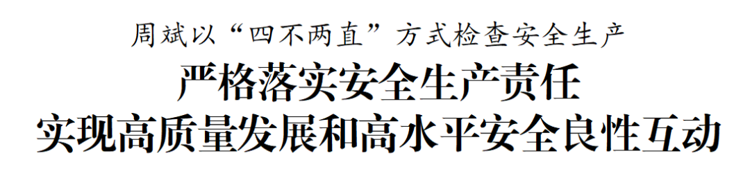 周斌在调研中强调,安全生产工作须臾不可懈怠、丝毫不可放任、时刻不可松劲。各地各部门要进一步抬高政治站位,坚持党政同责、一岗双责、齐抓共管、失职追责,全面推进安全生产治本攻坚三年行动,做到主动发现问题、及时解决问题,不断提升本质安全水平,保障人民群众生命财产安全,为勇当发展新质生产力重要阵地“碳路先锋”提供有力支撑。